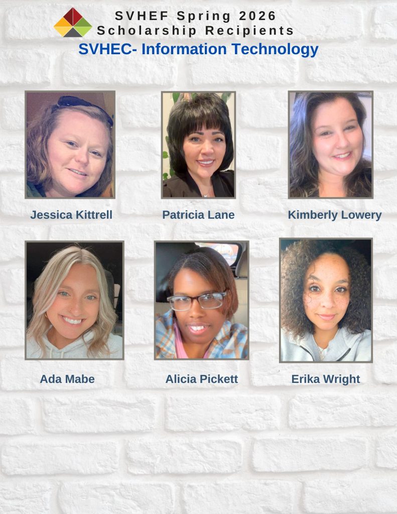 The Foundation (SVHEF) Scholarship was awarded to Ron Becker (Cybersecurity), Ky Carr (IT), Kassiti Jackson (Nursing), Zachary Perkins (Computer Science), Kameron Satterfield (Science), Jameson Sherman (HVAC), Zachary King (Welding), Barron Scott (Welding), Roger Owen III (IMEI), Stacy Powell (IMEI), Micah Williamson (IMEI), Durrell Chandler (IMEI), Quamel Foster (IMEI), Maurice Hankins (IMEI).