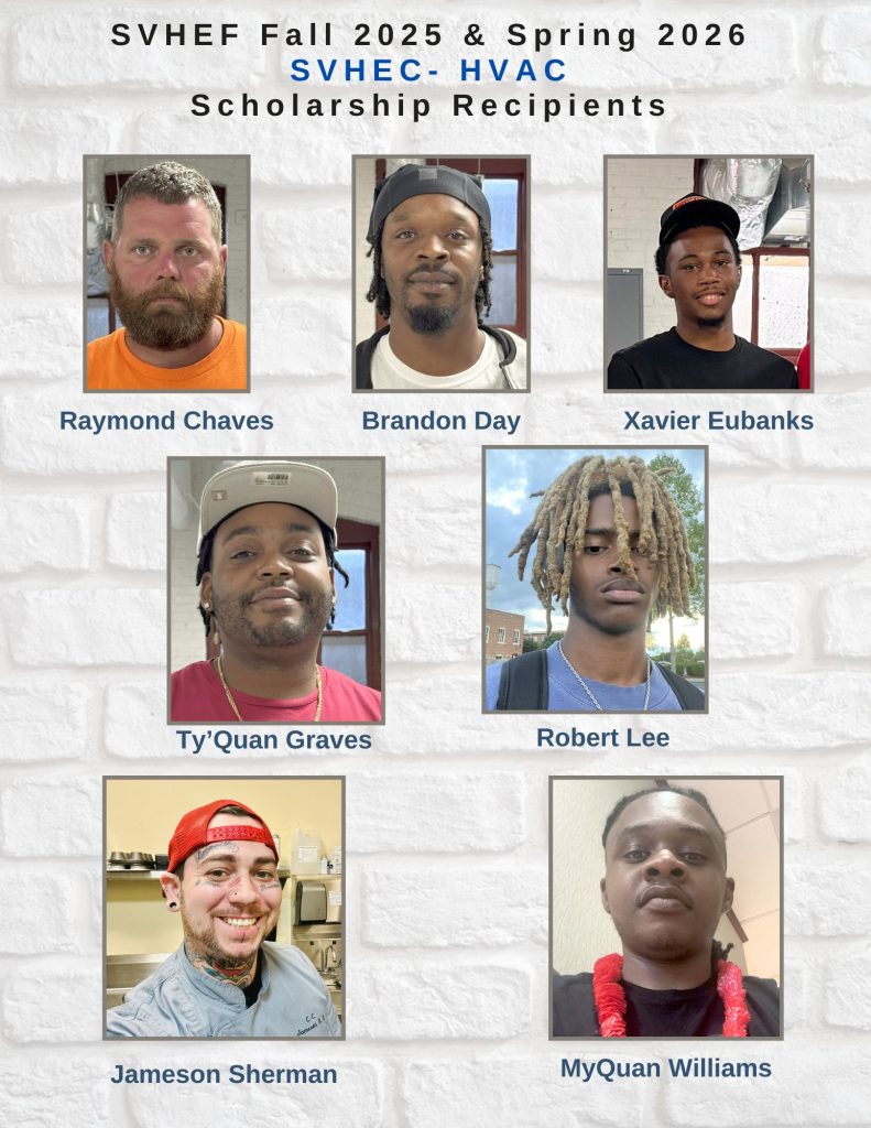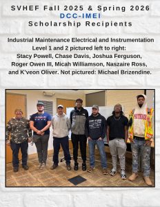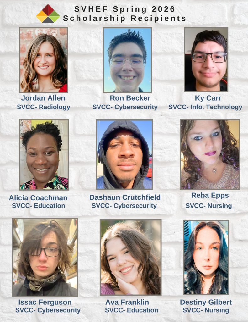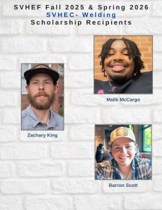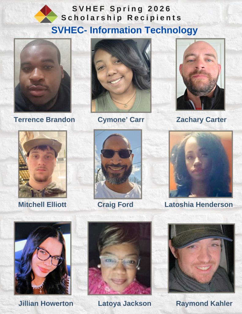 The Foundation (SVHEF) Scholarship was awarded to Ron Becker (Cybersecurity), Ky Carr (IT), Kassiti Jackson (Nursing), Zachary Perkins (Computer Science), Kameron Satterfield (Science), Jameson Sherman (HVAC), Zachary King (Welding), Barron Scott (Welding), Roger Owen III (IMEI), Stacy Powell (IMEI), Micah Williamson (IMEI), Durrell Chandler (IMEI), Quamel Foster (IMEI), Maurice Hankins (IMEI).